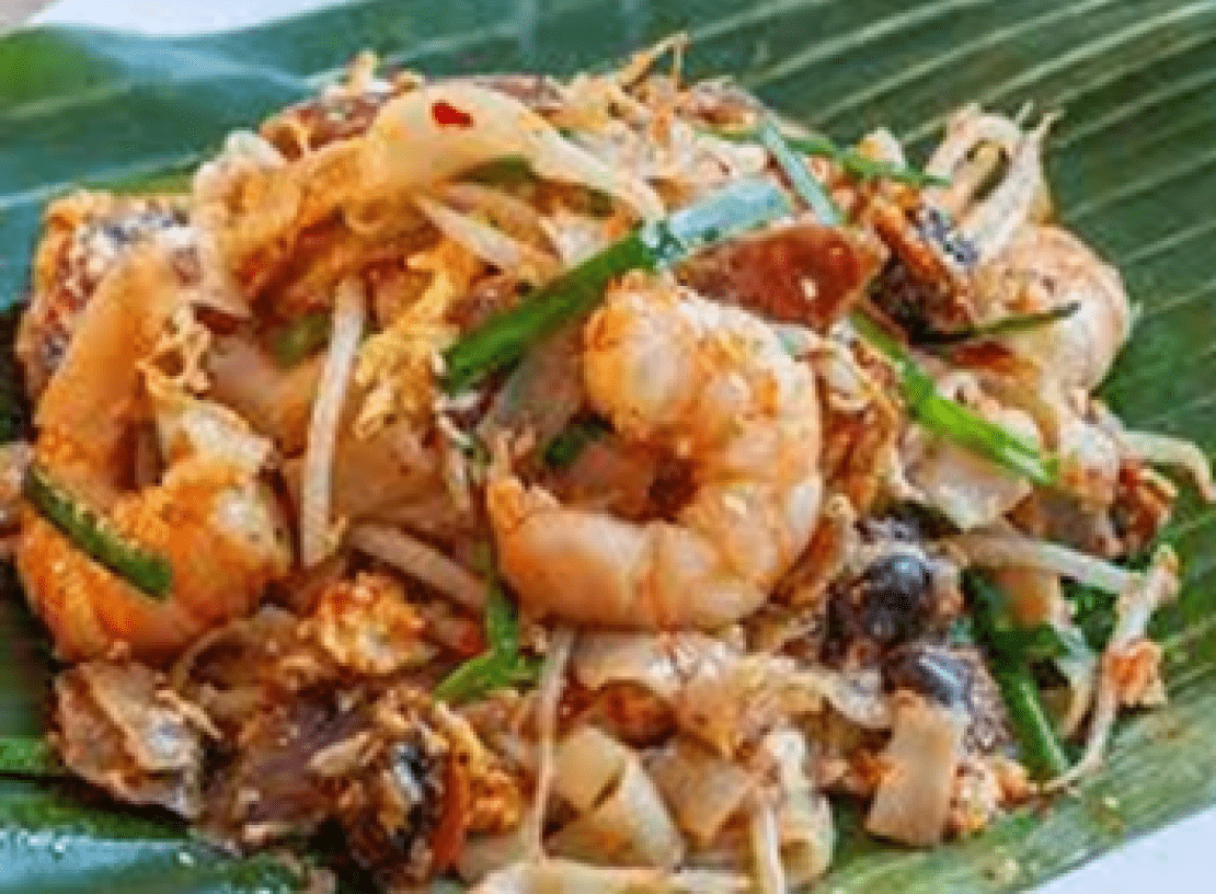Stir-fried flat rice noodle with eggs, prawns, cockles and beansprouts.
