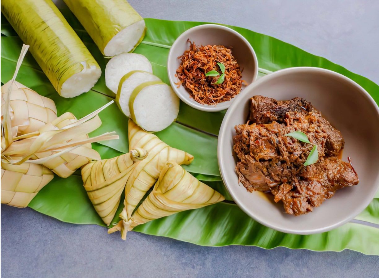 Slowly cooked beef that's readily to eat with local rice cake, ketupat